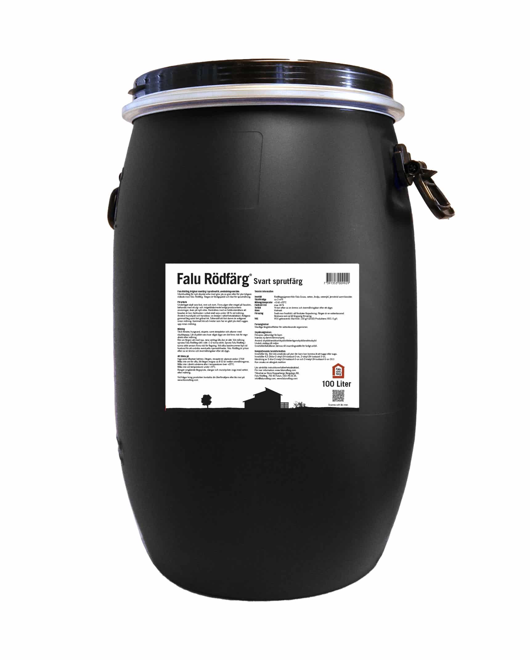Falu Rödfärg Original Svart, här i sprutfärgskvalitet på 100 liters fat. En mycket uppskattad kulör bland arkitekter och designers och allt vanligare i modern träarkitektur.